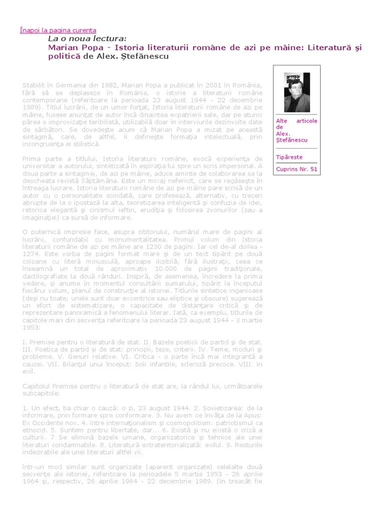A short summary of this paper... Bibliography goldis, alex, critica in tranşee. Editura semne, bucureşti, ştefănescu, alex, istoria literaturii romane contemporane () (a history. 37 full pdfs related to this paper. A short summary of this paper. Istoria literaturii române contemporane prefaţă în această lucrare nu bat drumuri noi, ci mă întorc pe un drum bătut de mult, a cărui concluzie a fost o istorie similară, concepută în şase mari volume, apărută în cinci, şi oprită la 1925. Sigur, o astfel de istorie nu face ierarhii, nu emite judecăţi de valoare.ea recuperează însă un trecut, îl restituie pentru o mai dreaptă judecată a devenirii literaturii române contemporane. 6 full pdfs related to this paper.. Această istorie are şi interviuri cuprinzătoare şi felii de interviuri.